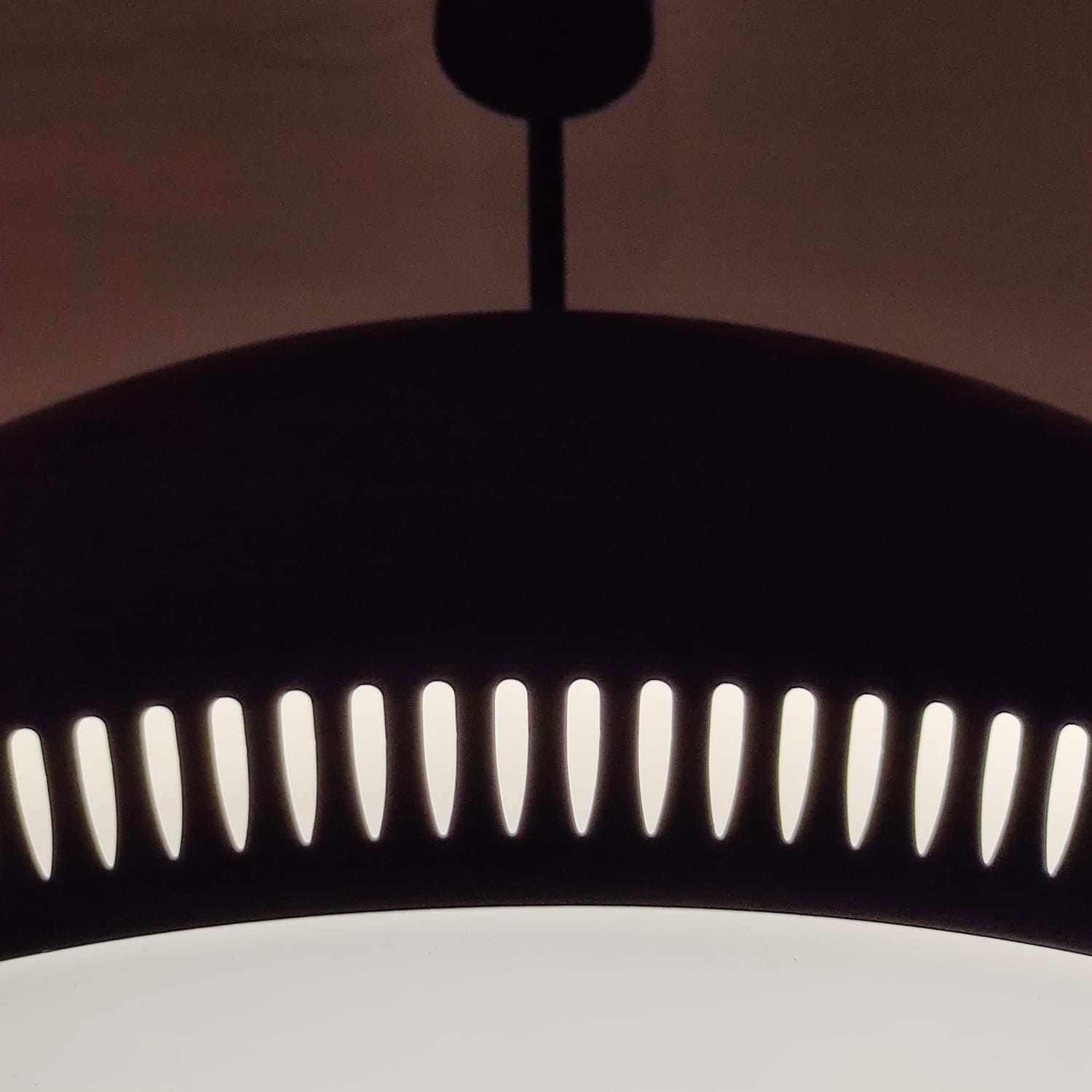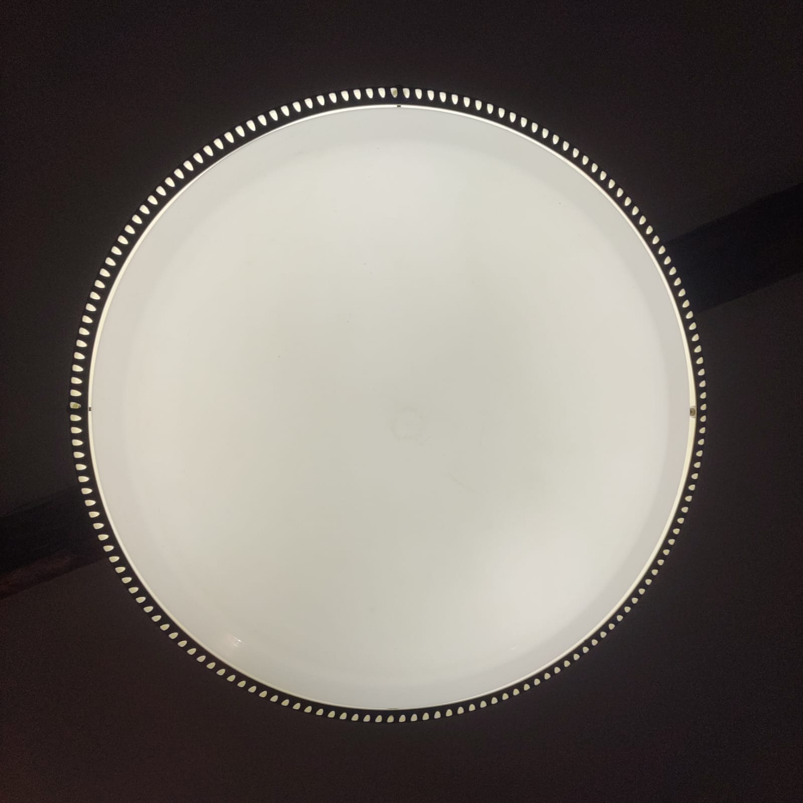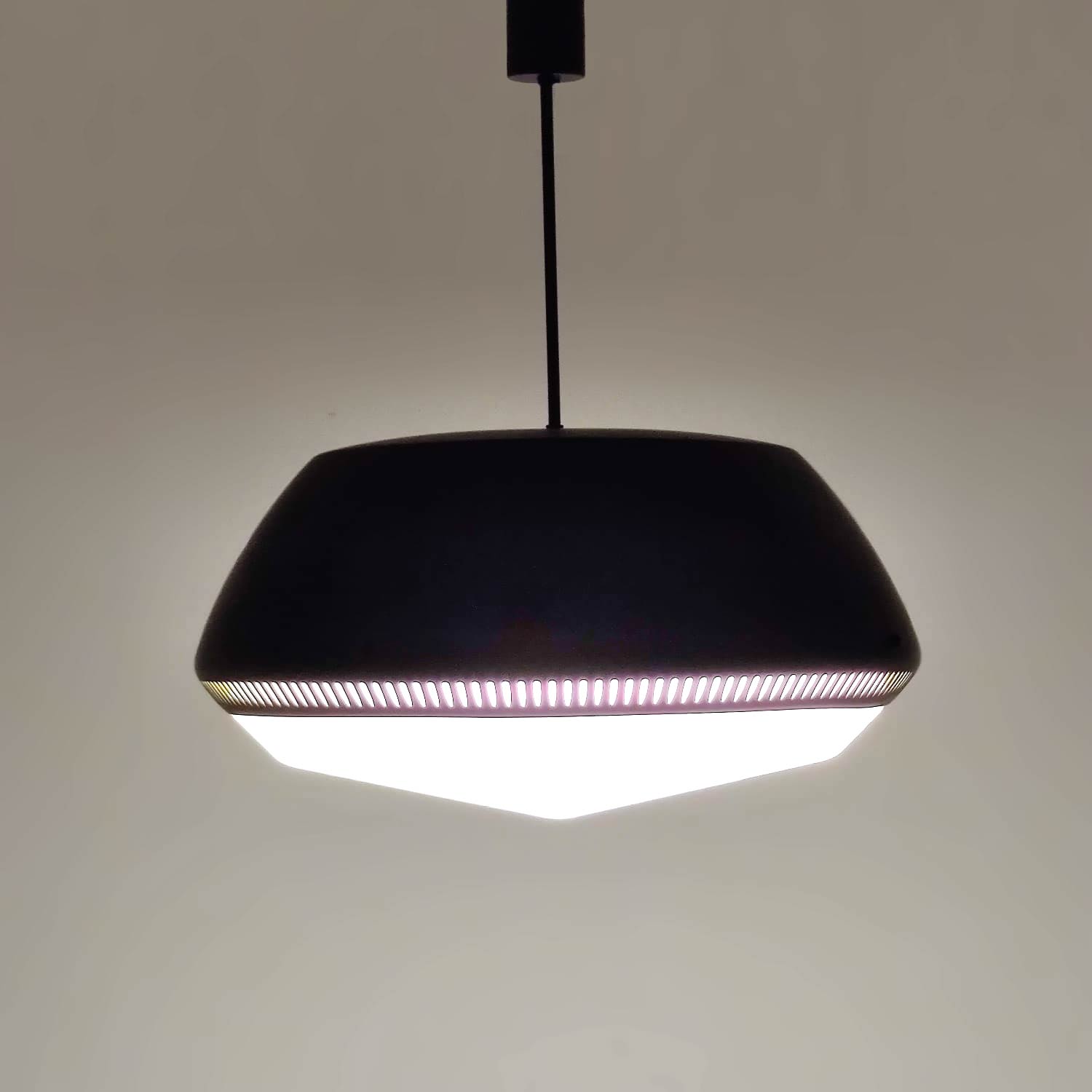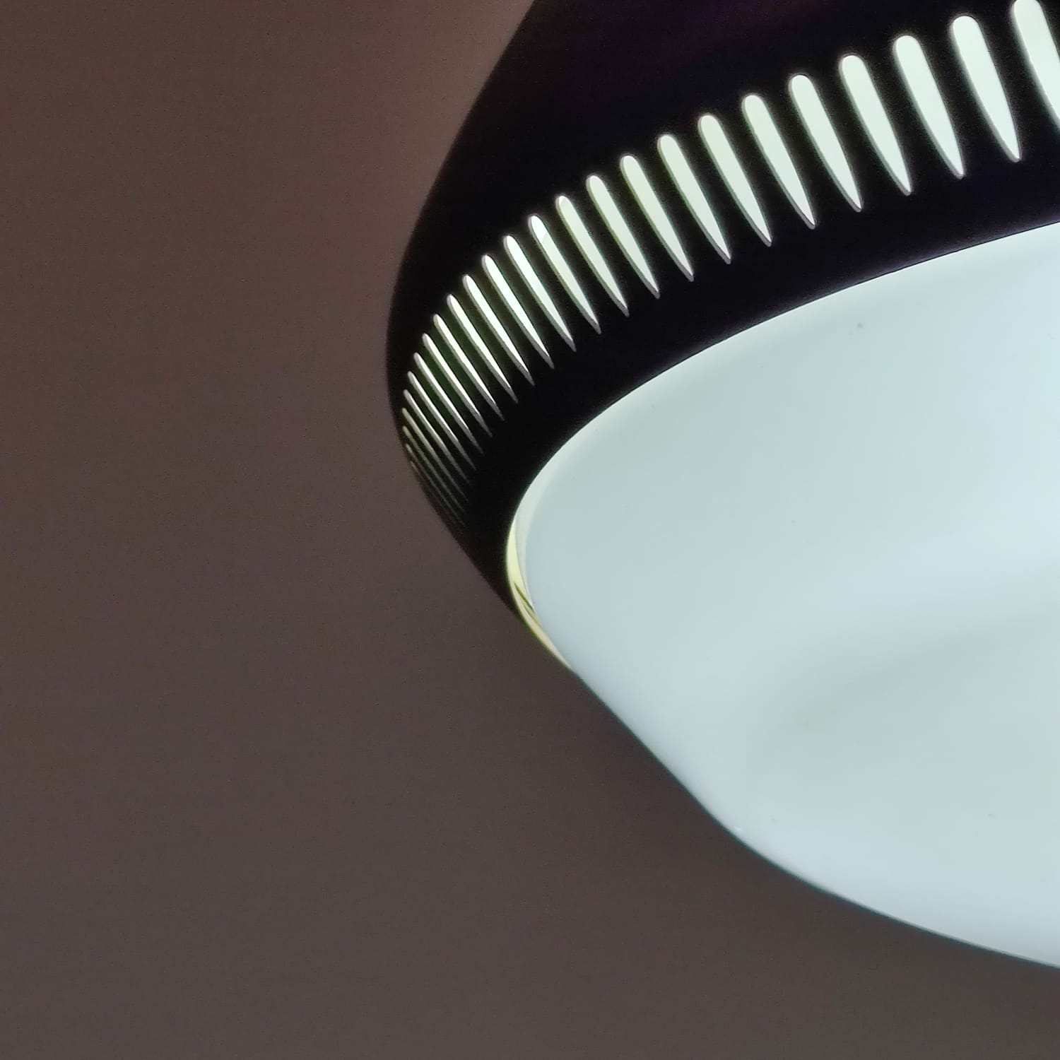 This model, the Greson 2, was designed by the renowned Italian architect and designer Gio Ponti (1891-1979), and produced by Greco in the 1950s. It features a black-painted metal frame with a white Perspex diffuser. The original electrics are all still in place and function perfectly. This example is in near perfect condition.