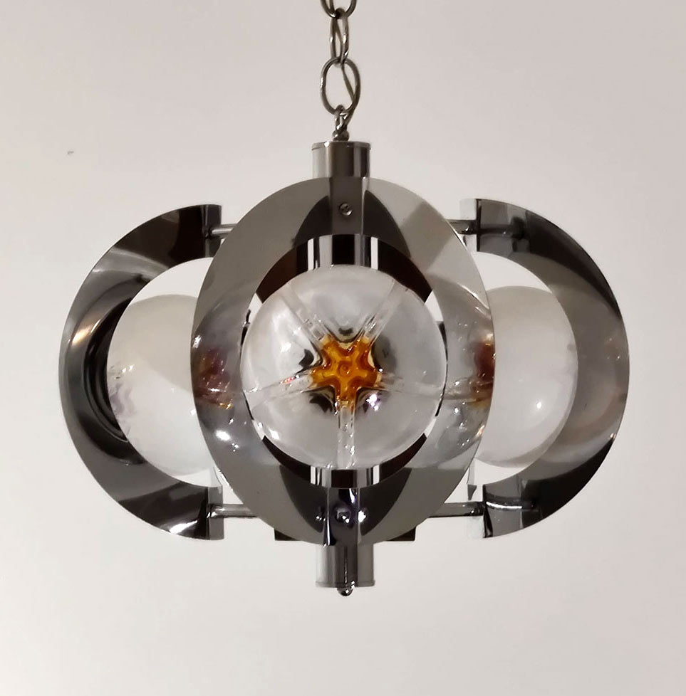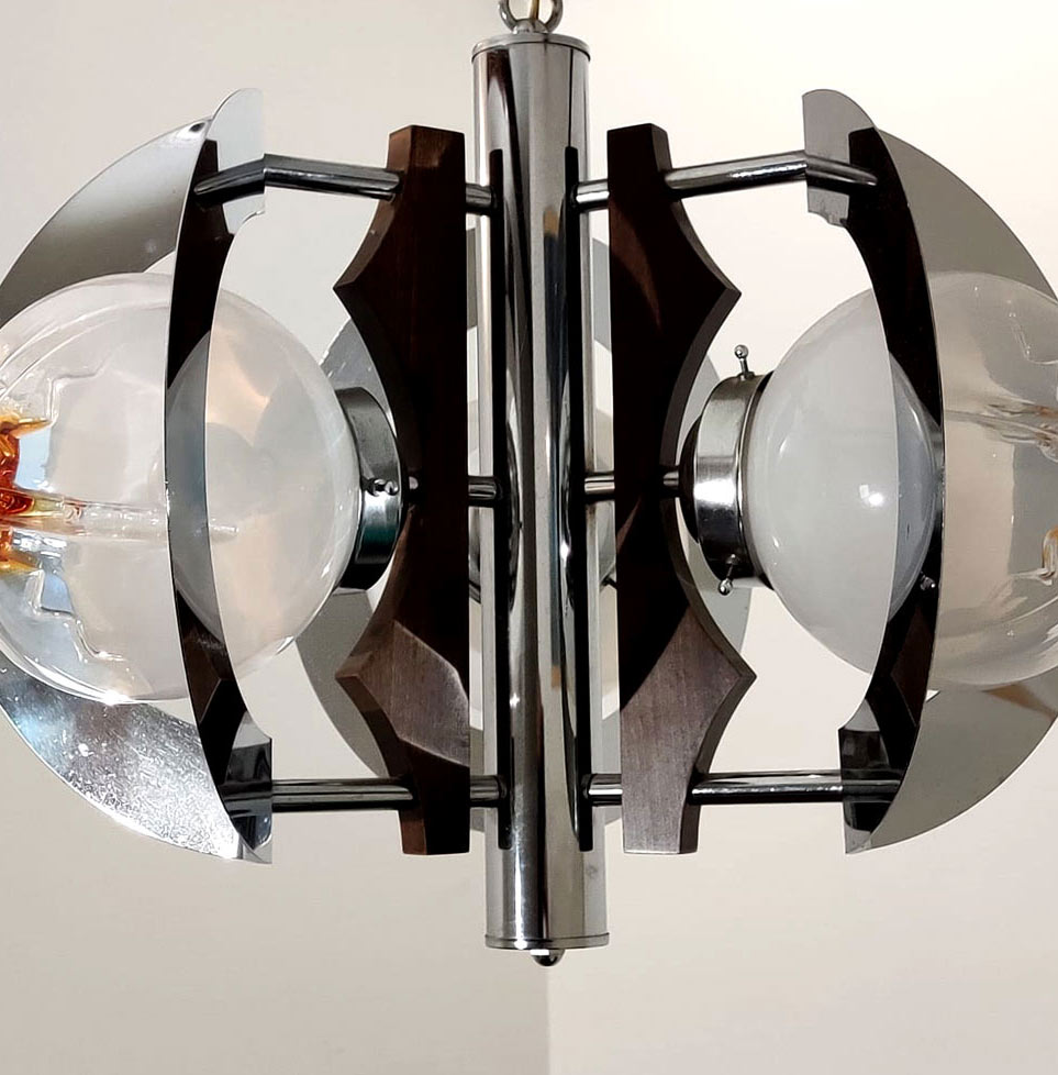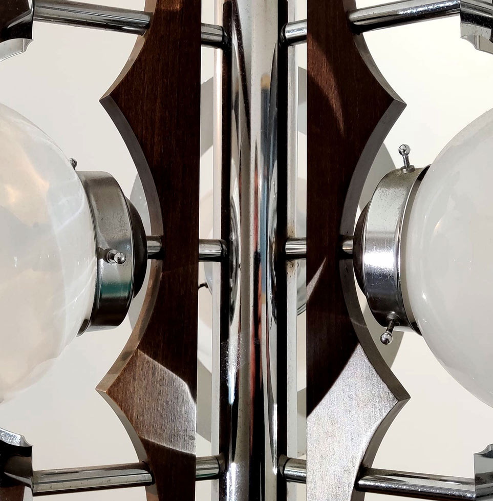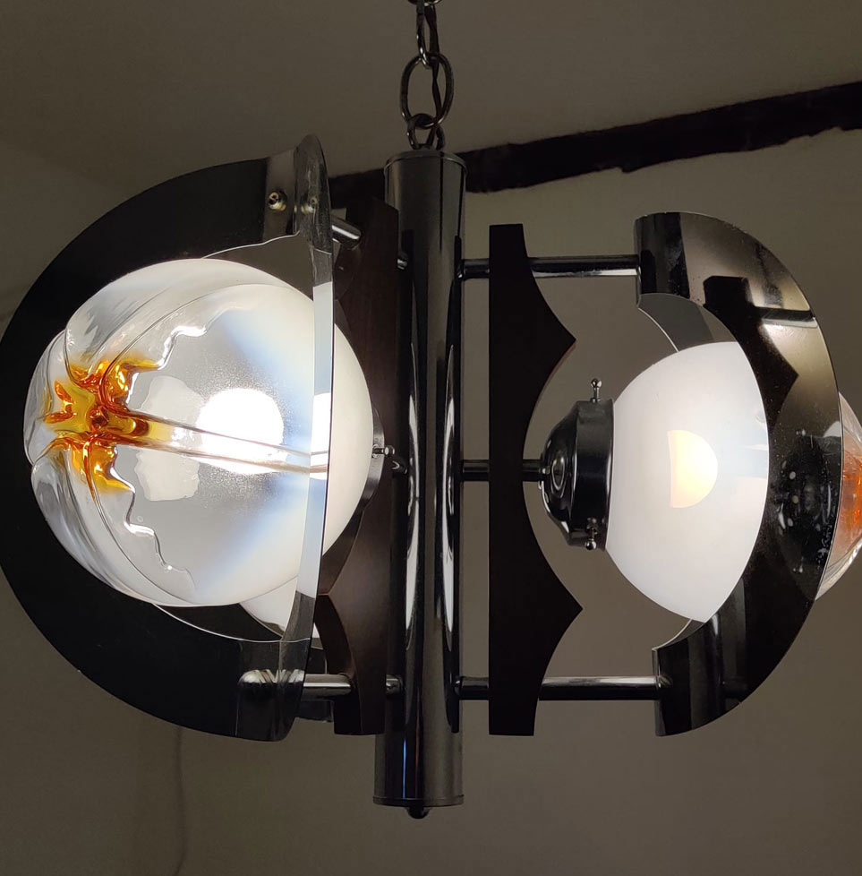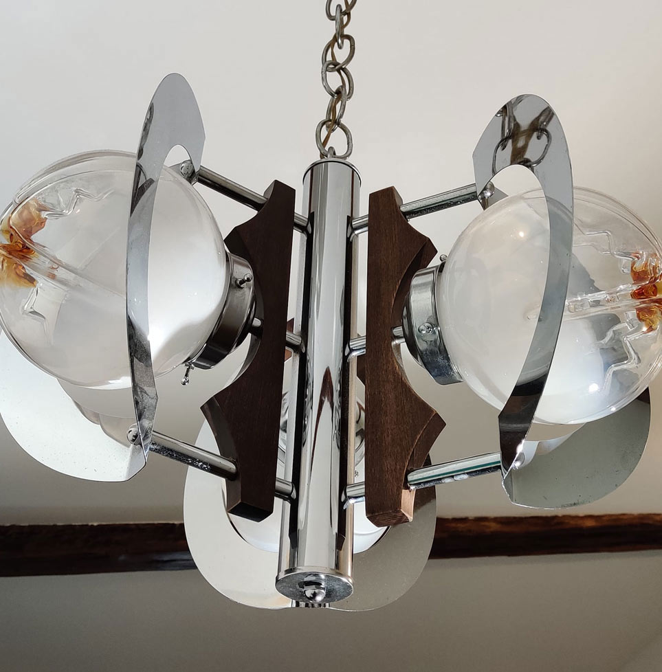 This 1970's Space Age pendant lamp, designed by renowned Murano lighting company Mazzega, expresses a flamboyantly futuristic design style. It features Murano glass diffusers and a chrome and wood framework. Often attributed to Toni Zuccheri. Only very minor signs of age on chrome.