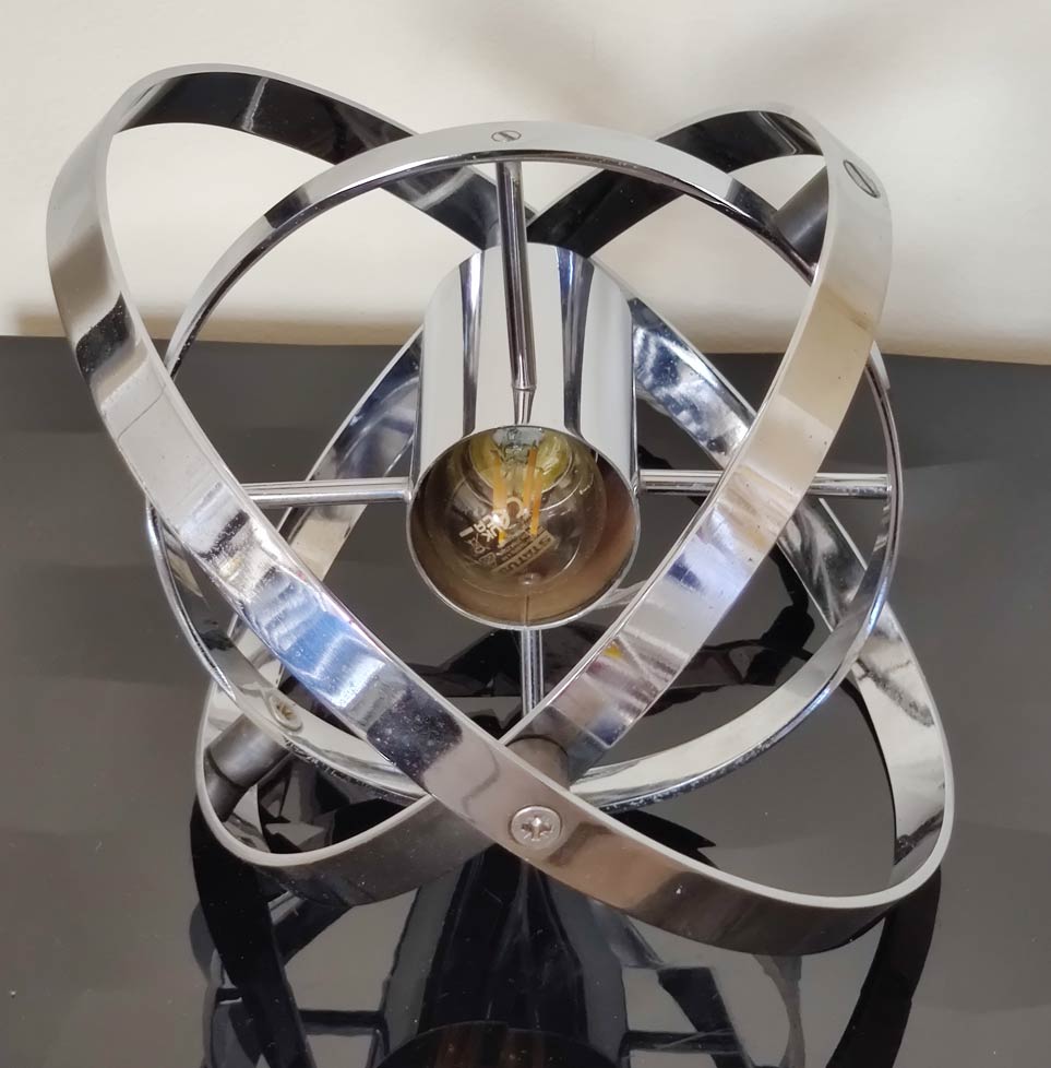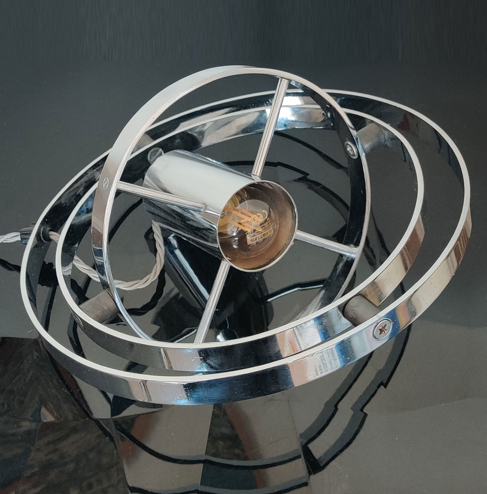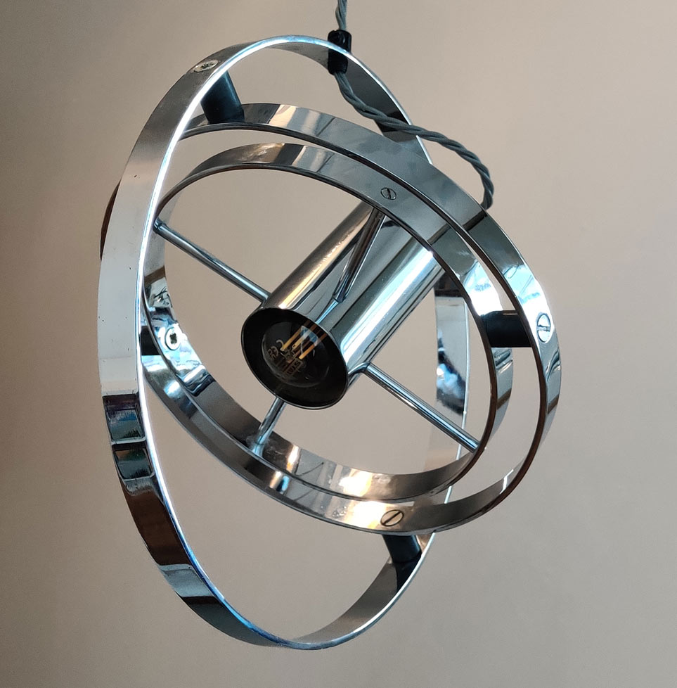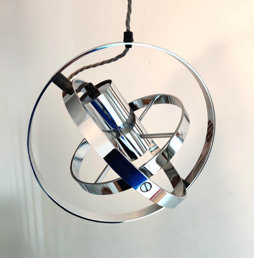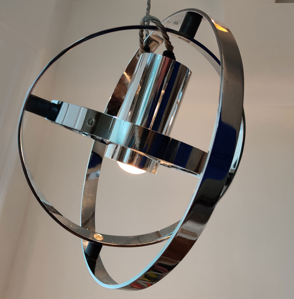 A stunning metamorphic chrome pendant / table light designed by Anthony Staples and Angus Wallace for Prime Mover at Design Centre London. Crafted from chrome with simple aluminium bolts, this rare gem of a lamp provides the perfect directional light, so works well as a reading lamp or as a central pendant. An iconic design sold exclusively at Design Centre London, this is a rare example of a unique and highly sought after design.