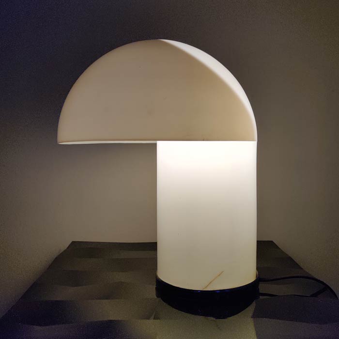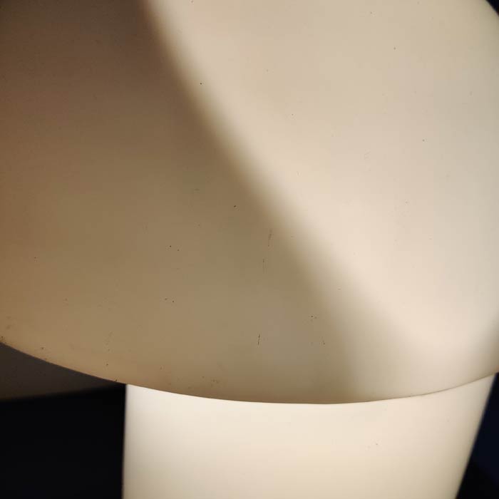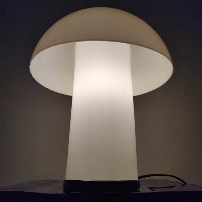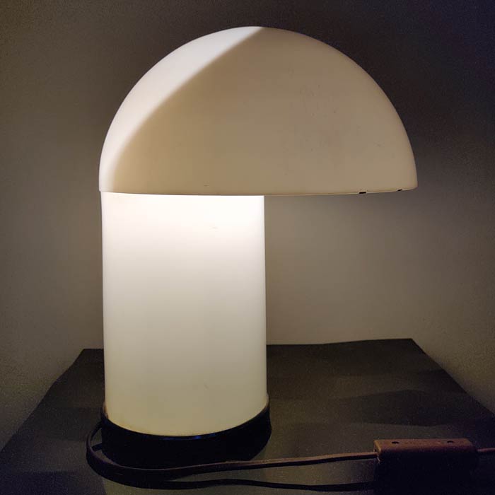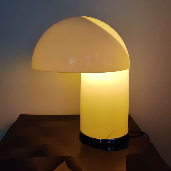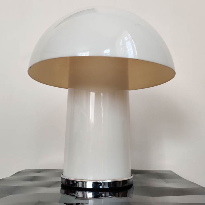 The "Leila" lamp is a collaboration of Verner Panton and Marcello Siard from 1968 and produced by Collezioni Longato Padova, Italy. A rare Italian mid-century design collector's item. The acrylic lampshade has a beige/ off-white color and is the result of the fusion of a tube and a hemisphere. It features a chrome base. The lamp is in very good used condition. The shade shows minor scratches and a crack at the base. None of the scratches are visible when the lamp is switched on.
