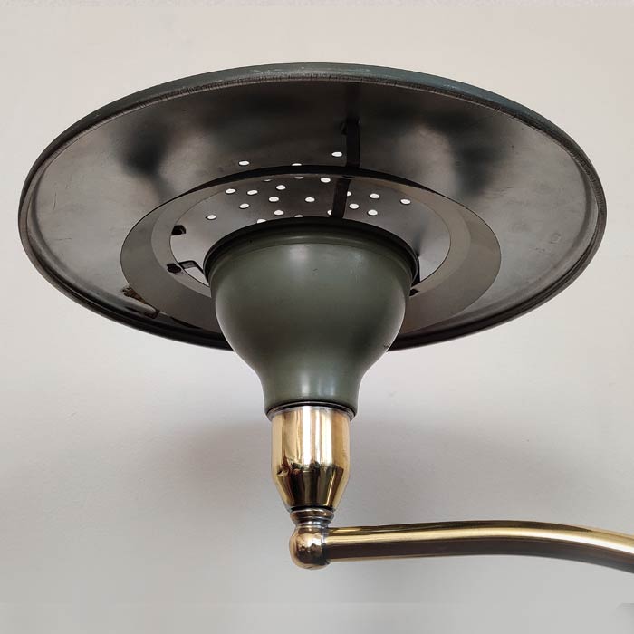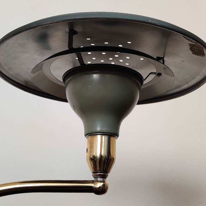 The classic 'Sightlight' desk table lamp by American company MG Wheeler Co.Inc. from the mid-50s, in two shades of green with brass details. Solid heavy square base with a brass rotating ball with a curved pole that supports the UFO-like shade. The swing arm design adds functionality and versatility. This example retains it's original numbered model and licensee stickers.