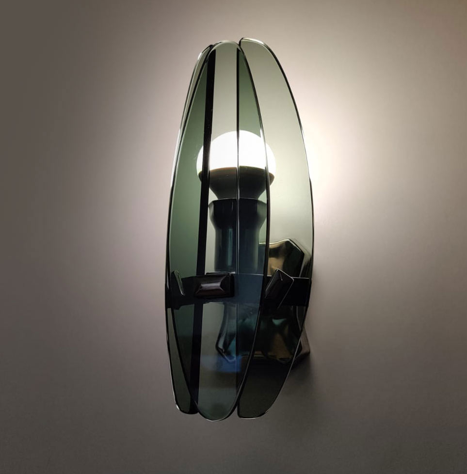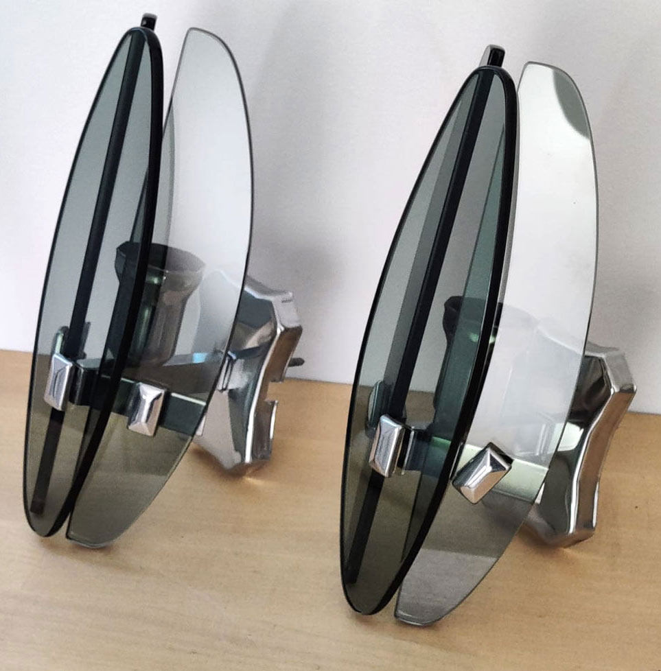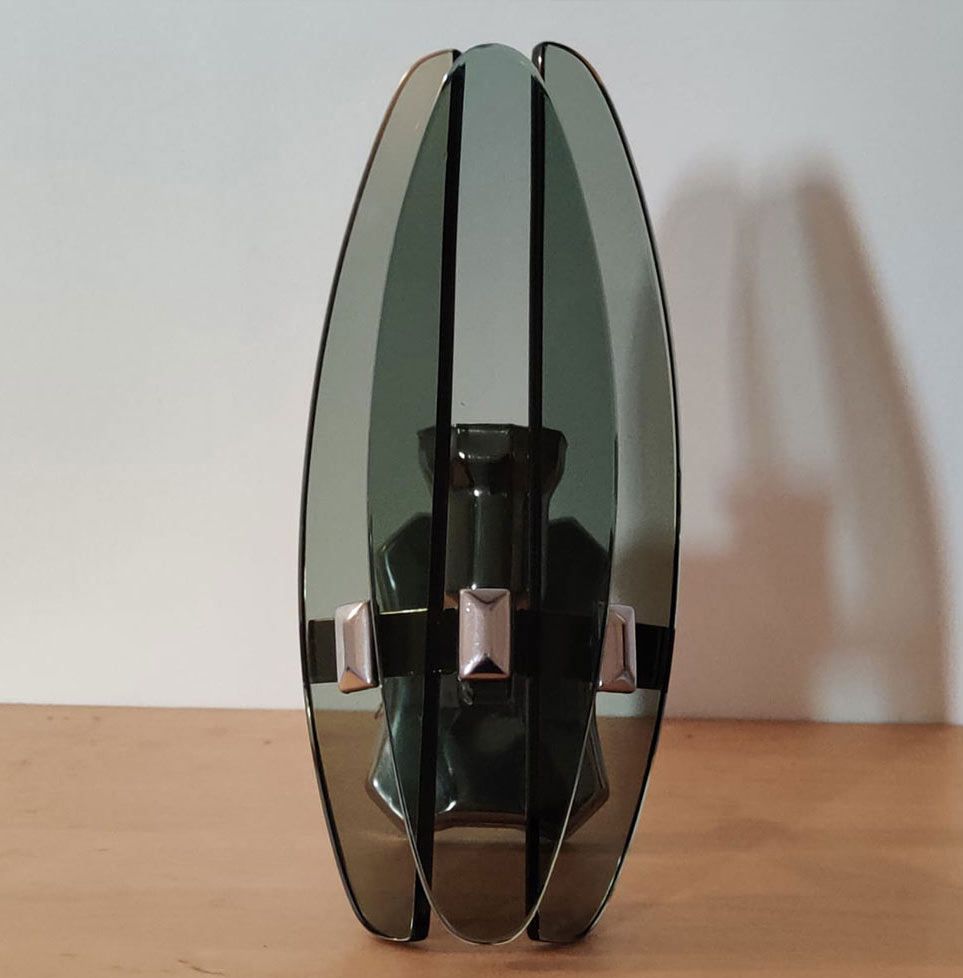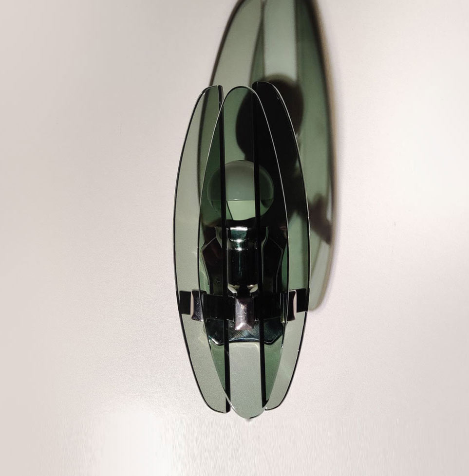 A pair of wall lamps made by Veca in 1970s. Each lamp has a front and two angled pieces of smoked Murano glass. These lamps are in very good condition with little signs of age.